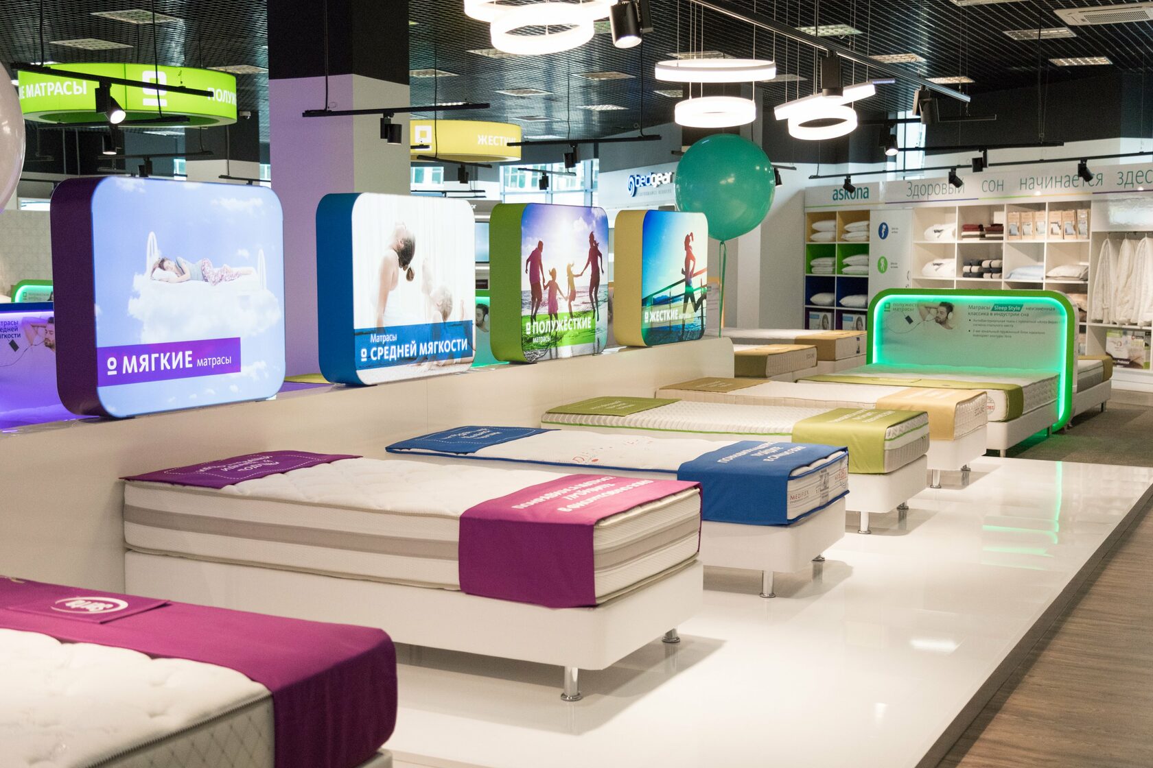 Магазин товаров для здорового сна в ТРК SBS MEGAMALL. Полноценная автоматизация на базе программного продукта 1С: Управление торговлей с сервером и тремя рабочими местами: кассир, товаровед, бухгалтер. Для печати этикеток используется термотрансферный принтер TSC TE-200, для чеков — АТОЛ 20Ф.
